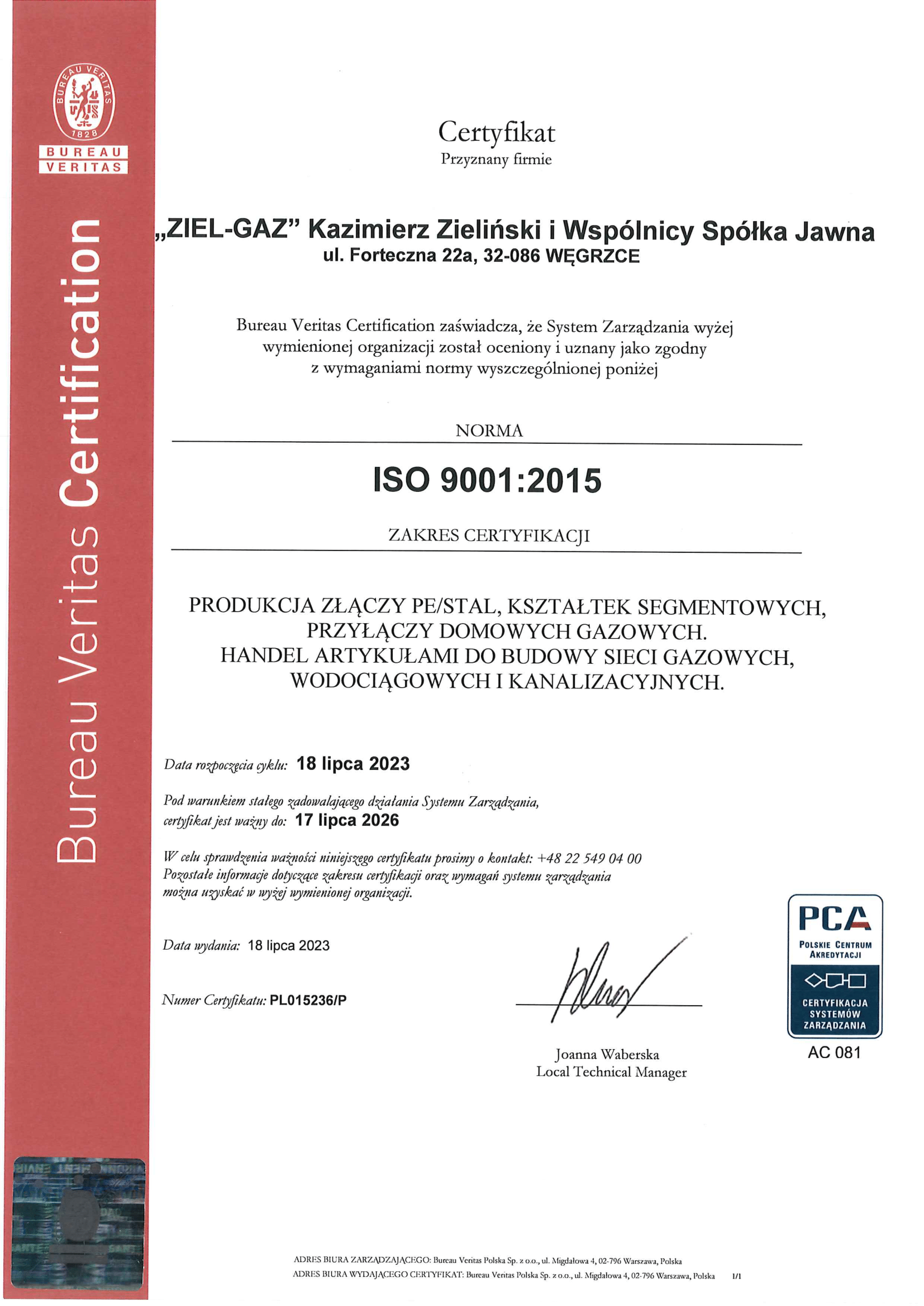 Firma Ziel-Gaz Kazimierz Zieliński i wspólnicy spółka jawna od 2002 roku posiada certyfikat ISO 9001:2015 dla produkcji przyłączy domowych, złączy PE/STAL oraz handlu artykułami do budowy sieci gazowych, wodociągowych i kanalizacyjnych.